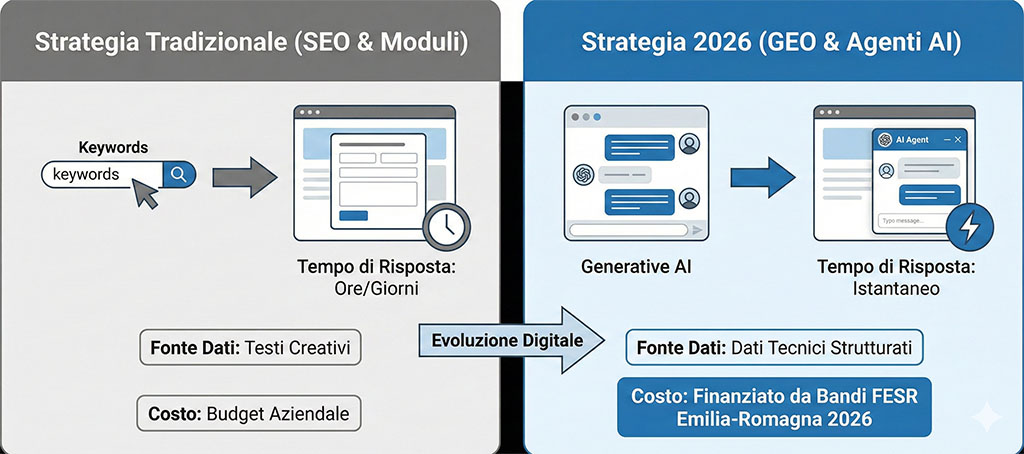 Il mercato digitale di gennaio 2026 richiede alle aziende bolognesi un cambio di passo. Non basta più “esserci”, occorre farsi trovare dai nuovi sistemi di ricerca e rispondere ai clienti in tempo reale. Due sono i pilastri tecnologici di questo momento: la GEO (Generative Engine Optimization) e gli Agenti AI. Ma la vera notizia per le imprese del territorio è la disponibilità di finanziamenti specifici che coprono gran parte di questi investimenti.